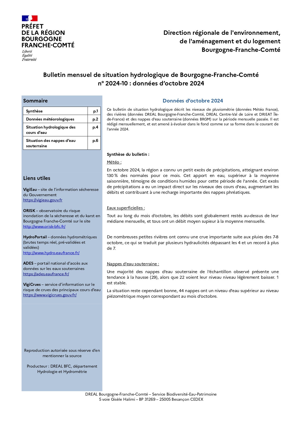 Bulletin mensuel de situation hydrologique n°2024-10 : données d'octobre 2024