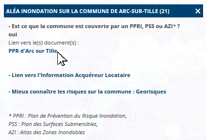 Lorsque l'on clique sur une commune (via l'outil main ou flèche), une fenètre apparait (exemple ci-contre) listant le ou les documents existants sur la commune.