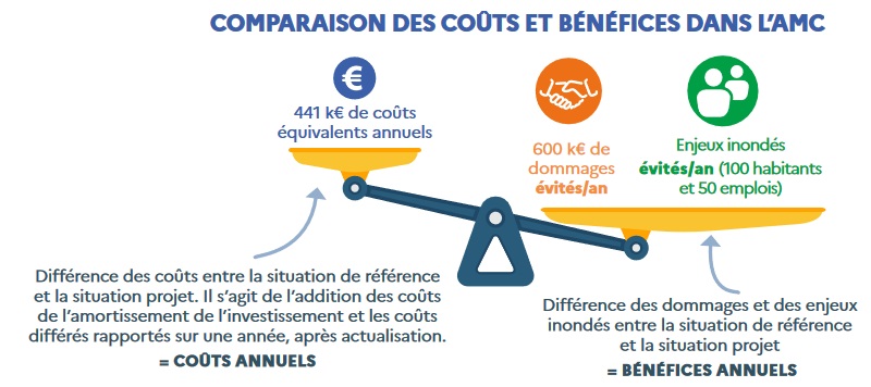 La méthode proposée dans le guide, dite analyse multicritère (AMC), permet de répondre à l’ensemble de ces questions. Elle a, en effet, pour objectif d’analyser les impacts d’un projet sur la réduction des conséquences des inondations sur la santé humaine, l’économie, l’environnement et le patrimoine. Ces impacts sont mis en perspective avec les coûts du projet.
