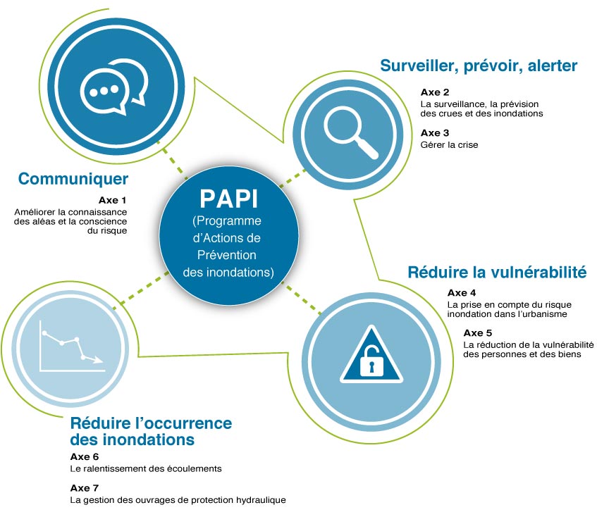 Les programmes d’actions de prévention contre les inondations (PAPI), portés par les acteurs locaux (collectivités territoriales ou leurs groupements), ont pour objet de promouvoir une gestion intégrée des risques d’inondation sur un bassin de risque cohérent, en vue de réduire leurs conséquences dommageables sur la santé humaine, les biens, les activités économiques et l’environnement.